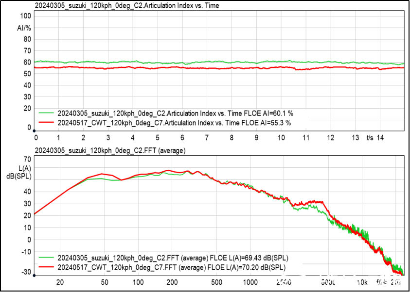 3、環(huán)境風(fēng)洞重卡風(fēng)噪試驗數(shù)據(jù)一致性良好,相同工況兩組數(shù)據(jù)差值A(chǔ)計權(quán)聲壓級0.1dB(A)以內(nèi),語音清晰度指數(shù)差值(AI)0.3%以內(nèi)。能夠精確排查方案貢獻量。