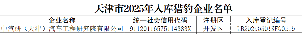 近日,天津市科技局發(fā)布“2025年天津市獵豹企業(yè)入庫名單公告”,中汽研(天津)汽車工程研究院有限公司(以下簡稱“中汽中心工程院”)憑借卓越的科技創(chuàng)新能力、高速成長的研發(fā)實力及突出的產(chǎn)業(yè)貢獻成功入選!這是政府和社會對工程院持續(xù)深耕行業(yè)、堅持自主創(chuàng)新的高度認可,也是企業(yè)發(fā)展歷程中的又一重要里程碑。