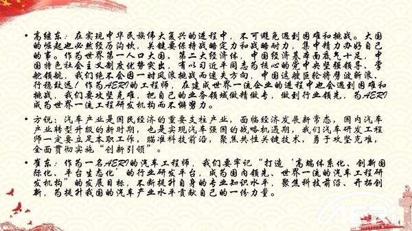 本次學(xué)習(xí)卓有成效地統(tǒng)一了全體黨員的思想戰(zhàn)線,進(jìn)一步樹牢 “四個(gè)意識(shí)”,堅(jiān)定“四個(gè)自信”,堅(jiān)持“兩個(gè)維護(hù)”,大大提高了支部的凝聚力與戰(zhàn)斗力。未來,第一開發(fā)部黨支部將繼續(xù)秉承璦睿人“激情、責(zé)任、感恩、奮進(jìn)”的文化理念,堅(jiān)持“開放、變革、創(chuàng)新”的發(fā)展理念,為將工程院打造成國內(nèi)領(lǐng)先、世界一流的汽車工程研發(fā)機(jī)構(gòu)而不懈努力,為我國的汽車工業(yè)貢獻(xiàn)力量?。ㄊ瘔?mèng)妍)